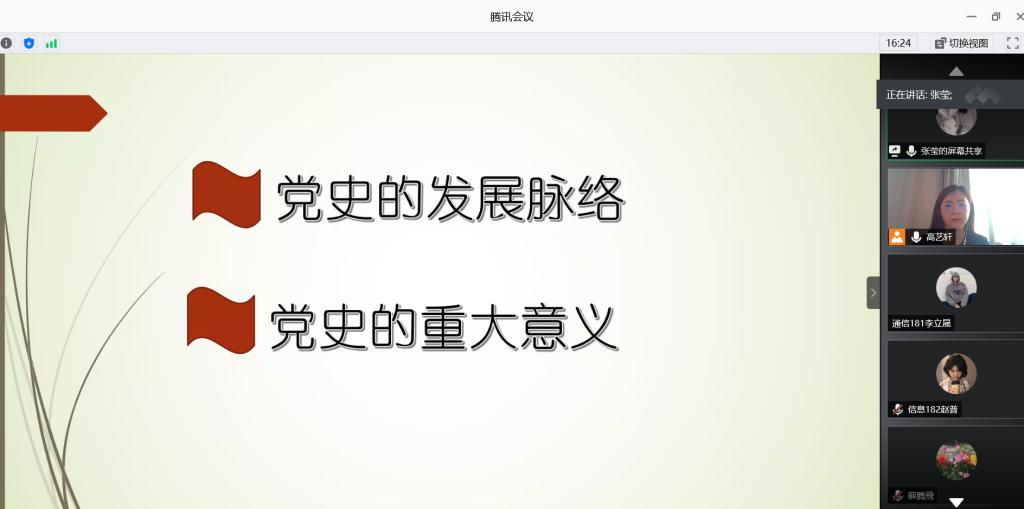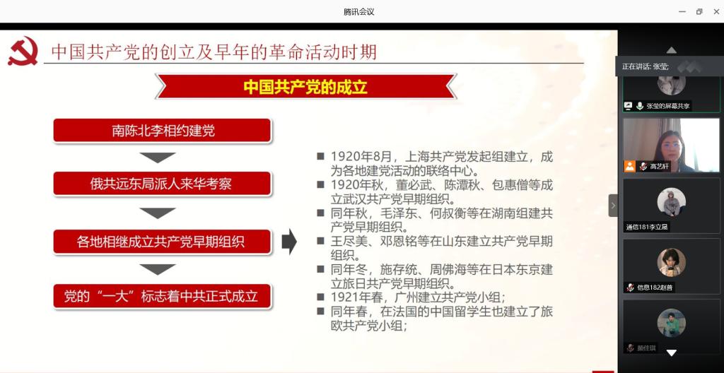 张莹带领大家学习回顾了党史的脉络和重大意义,从新民主主义革命时期(1919-1949)、社会主义革命和社会主义建设时期(1949-1978)、改革开放和社会主义现代化建设时期(1978-至今)三个阶段对党史的发展进行梳理。学习党史,可以从历史中汲取智慧和力量、是加强党的思想理论建设的重要任务,是继承党的成功经验和优良传统的需要。