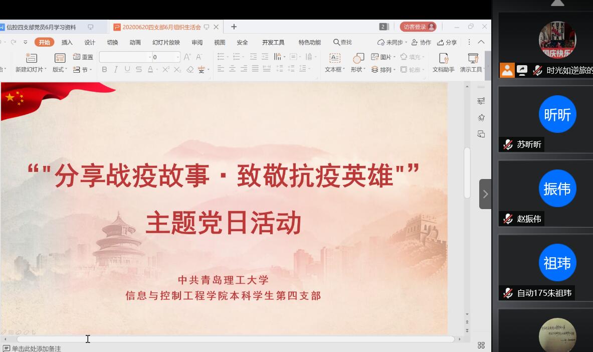 为致敬抗疫英雄、弘扬爱国主义精神,加强党员党性教育,6月29日下午,402cc永利官网本科学生第四支部开展“分享战疫故事·致敬抗疫英雄”主题党日活动。活动由支部书记王超主持,宣传委员高腾飞,组织委员季献涛及全体党员参加。