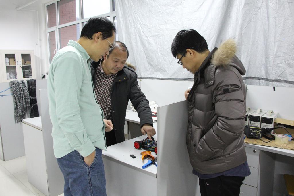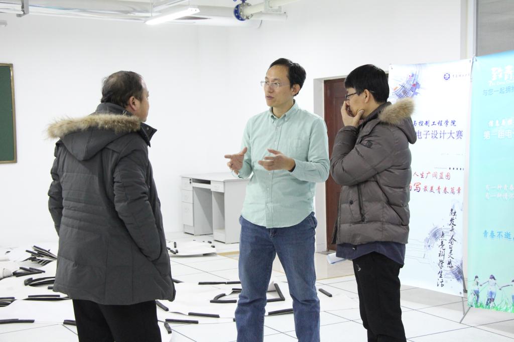 随后,尹宗毅一行来到信控学院实验楼进行了参观考察,秦臻介绍了学院的实验课程培养计划,学生参与全国大学生智能汽车竞赛、全国大学生电子设计大赛等学科竞赛的现状,并与寒假留校备战全国智能车竞赛的师生进行了交流座谈。