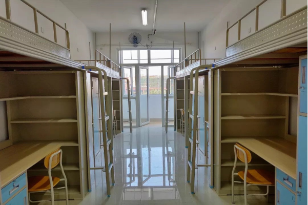 我们宿舍主要位于田径场西侧及篮球场北侧,宿舍统一为六人间,上床下桌。每人拥有独立衣柜、书架、杂物柜。